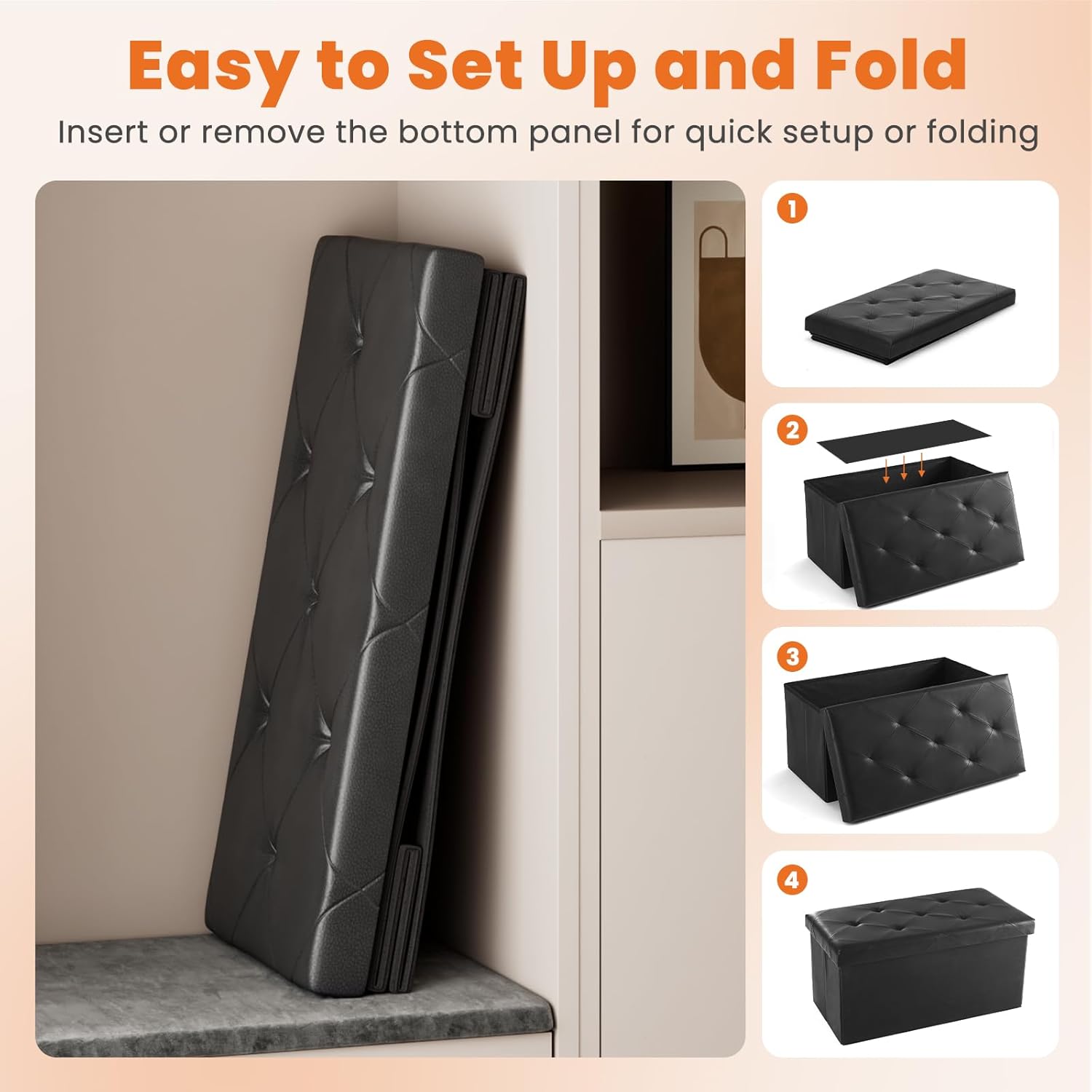 Sweetcrispy 30 Inches Folding Ottoman with Storage Bench, Foot Rest Stool, End of Bed Storage Bench Upholstered, Load 660 lbs, for Living Room, Lychee Grain Leather, Black