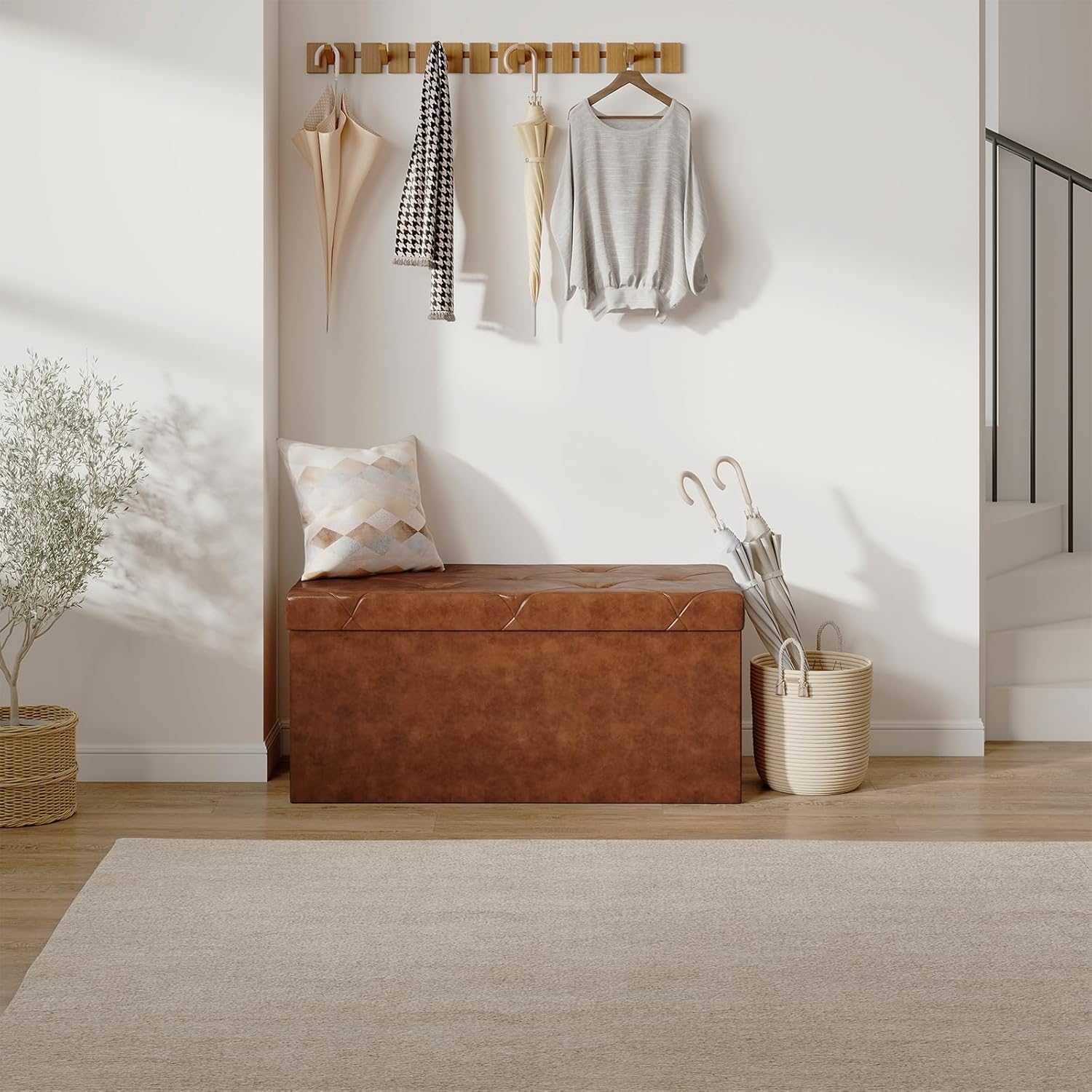 Sweetcrispy 30 Inches Folding Ottoman with Storage Bench, Foot Rest Stool, End of Bed Storage Bench Upholstered, Load 660 lbs, for Living Room, Synthetic Leather, Brown